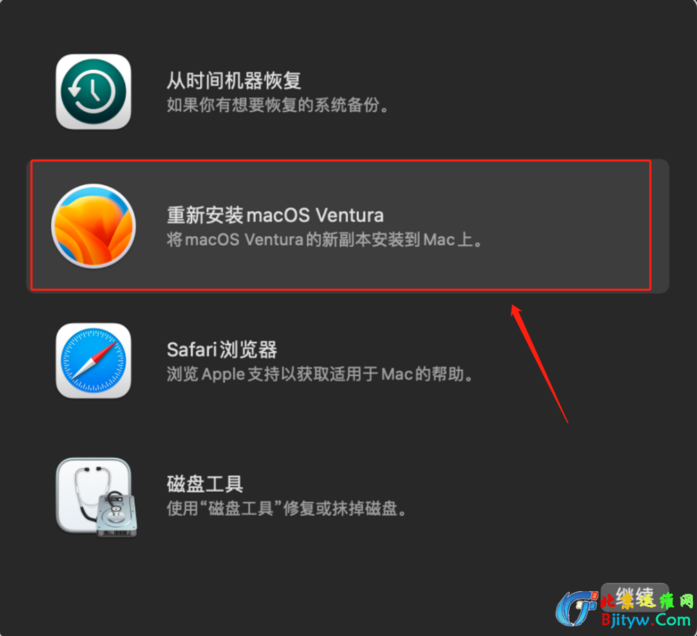 当你看到带有 macOS 重新安装选项的窗口时,即表示 Mac 已从恢复系统启动。